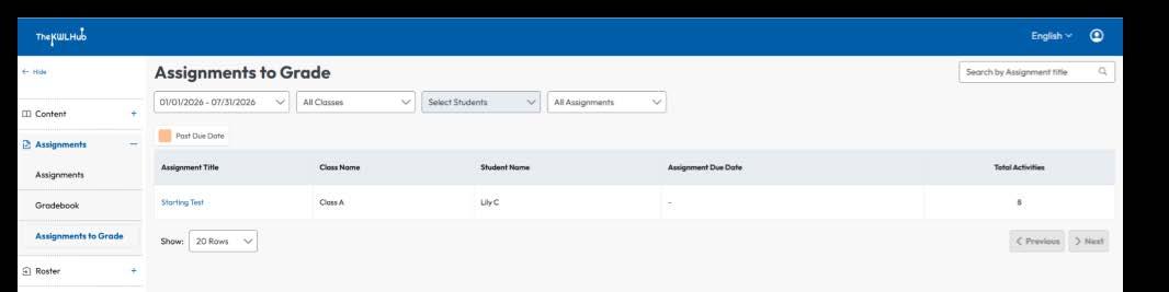 After a student submits an assignment, it is time to grade it. The KWL Hub includes features designed to make this process seamless, fast, and efficient. To access assignments that require grading, navigate to “Assignments” and click “Assignments to grade.” This section can also be accessed from the “Gradebook.”
