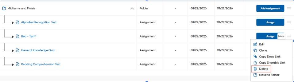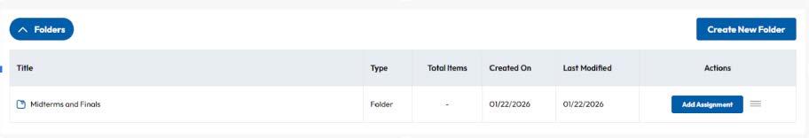 To edit or delete a folder, click the hamburger menu next to “Add Assignment” and select the appropriate option. From there, you can create a new subfolder, edit the folder name, or delete the folder.