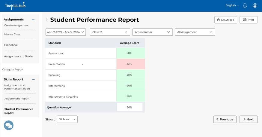 The most significant feature introduced with the new user interface is the Performance Report*, a tool that allows teachers to view detailed information about each student’s performance, organized by the key aspects of every completed assignment. This powerful tool helps teachers identify the areas in which students excel and those that may require additional support