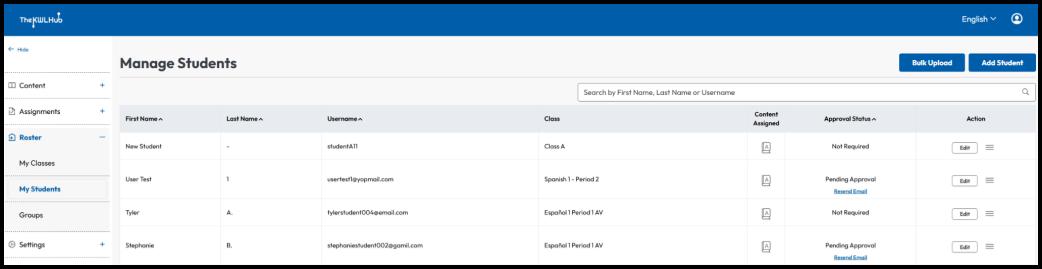 Here you will find information about all of your students. To access this menu, navigate to “Roster” and click on “My Students.”