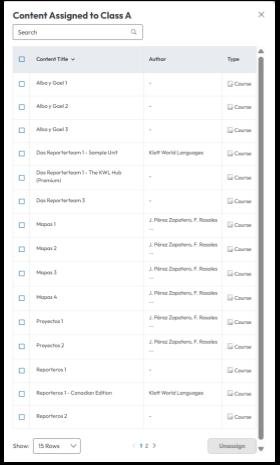 On this page, you can view all previously assigned content, see which students the content was assigned to, and unassign content whenever it is no longer required.