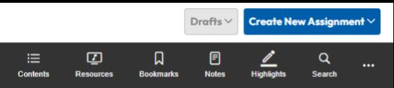 Drafts: Displays any assignments saved as drafts instead of published assignments. Create new assignment: Allows you to create an assignment directly from the activity you are currently viewing in the book. Both of the options above will be explained in further detail in the section on assignments.
