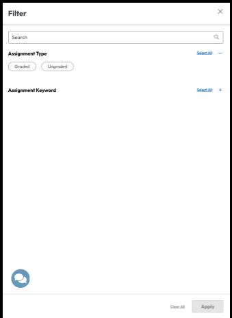 • The “Filter” button, which allows you to display only assignments of a certain type or containing a specific keyword.