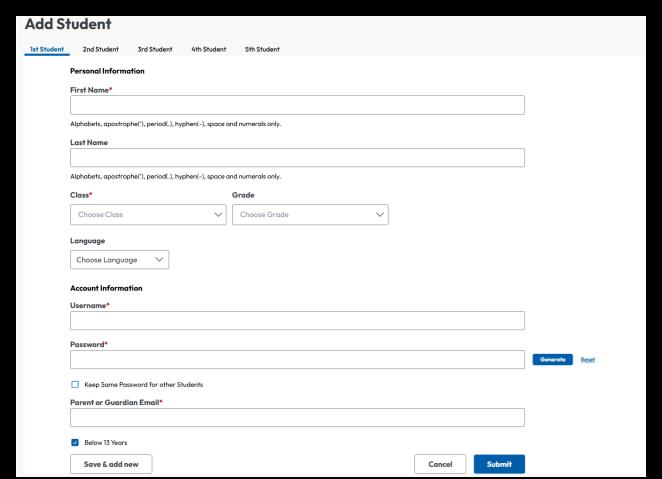 If you need to add individual students, you can use the “Add Student” feature. When you select it, a page will display a form with fields to complete. Once you’re done, click “Submit” to add the student to the system, or “Save and add new” if you need to manually add multiple students.