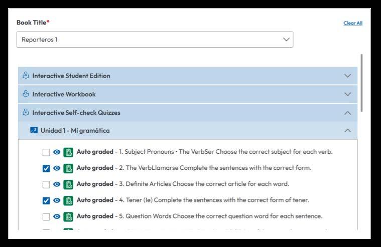 On the right panel, you can select any book you currently have access to in order to add activities to the assignment. Any checked activities will be added to the assignment.