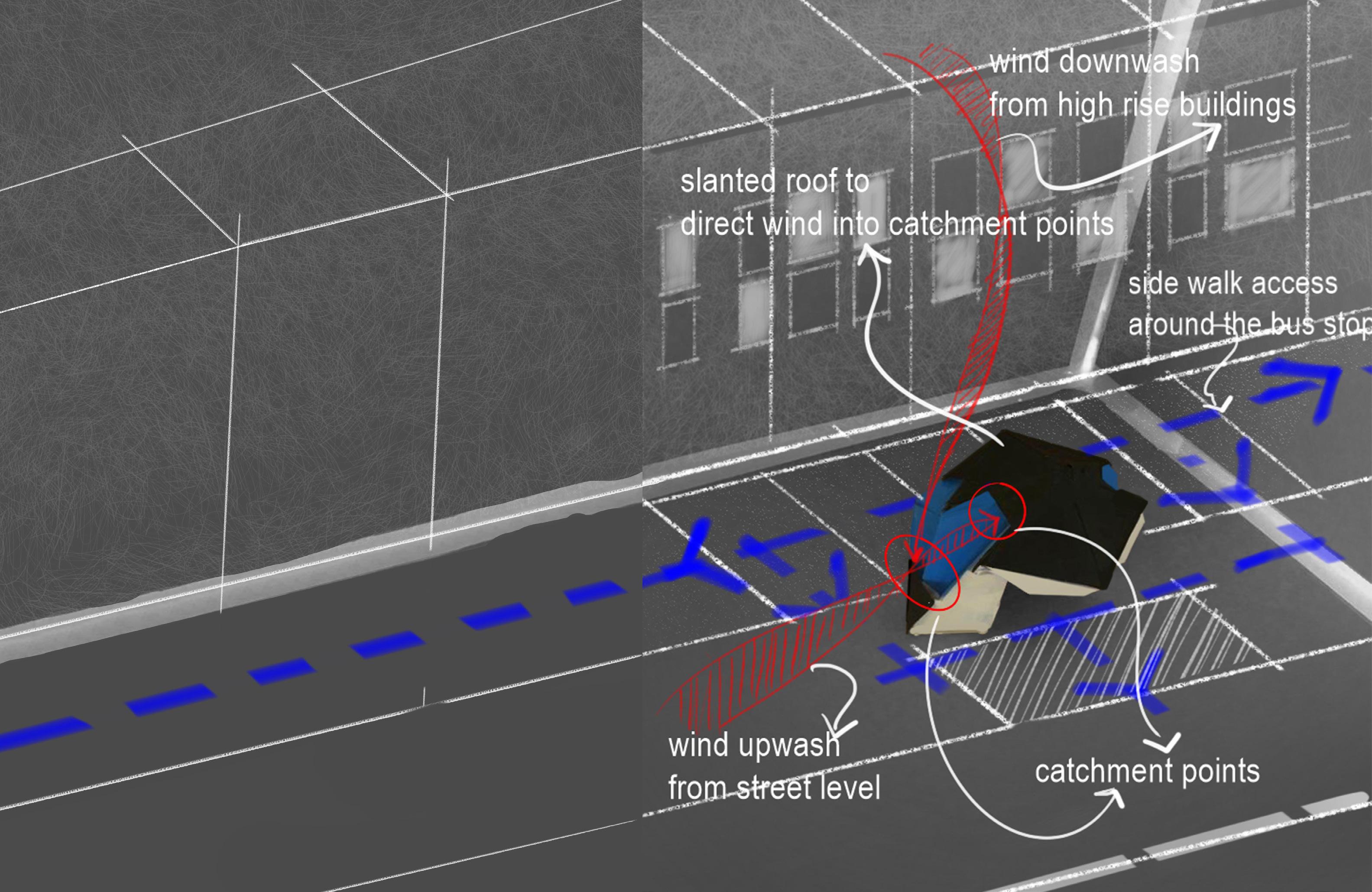 The bus stop captures wind, converts it into energy, and feeds it back into the energy grid. This is primarily accomplished by increasing its aerodynamic efficiency as it opens up during strong winds along Chap el Street, reduces downdrafts and redirects wind from the street level, making it habitable for human socio-outdoor activity. In addition, using the bus stop as a folly adds character to the street by changing how it operates by providing a welcoming point to large crowds.