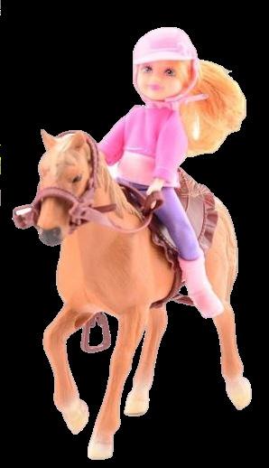 Dimenzije kompleta: 23 x 23 x 10 cm. Punčka nosi rožnato čelado in jahalne škornje, rjav konjiček pa je opremljen