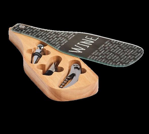 Visokokvalitetni vinski set sastoji se od čepa, umetka za točenje i otvarača za boce. Materijal: gumirano drvo / nehrđajući čelik / staklo. Boja: natural / crna / srebrna. Uputa za održavanje: operite ručno. Dimenzije: oko 10 x 27,8 x 3 cm.