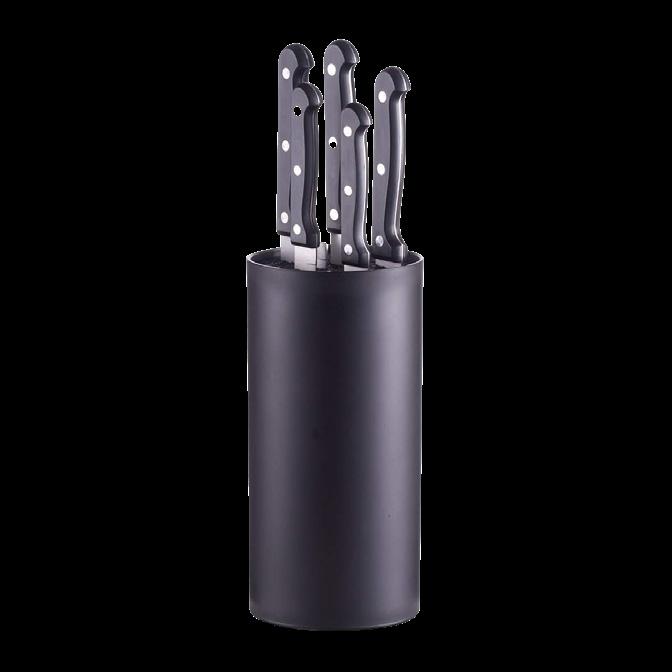 Moderni dizajn stalka s noževima u setu. Izrađen od plastike. Praktično spremanje noževa. Uložak iz stalka može se izvaditi. Set sadrži 6 noževa. Boja: crna. Dimenzije: cca Ø11 x 22 cm.