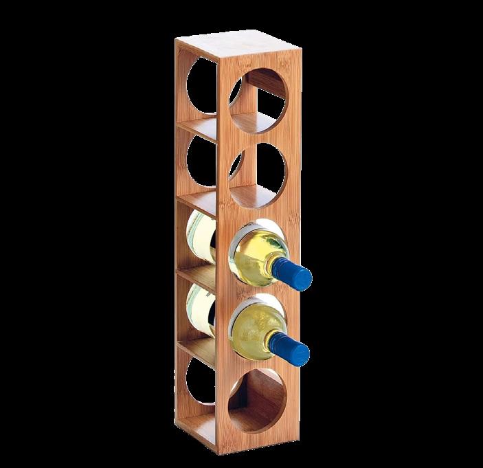 Praktični stalak za vino. Napravljen od finog bambusova drveta. Za 5 boca. Promjer otvora za boce: 9 cm. Može se montirati na zid. Dimenzije: cca 13,5 x 12,5 x 53 cm.