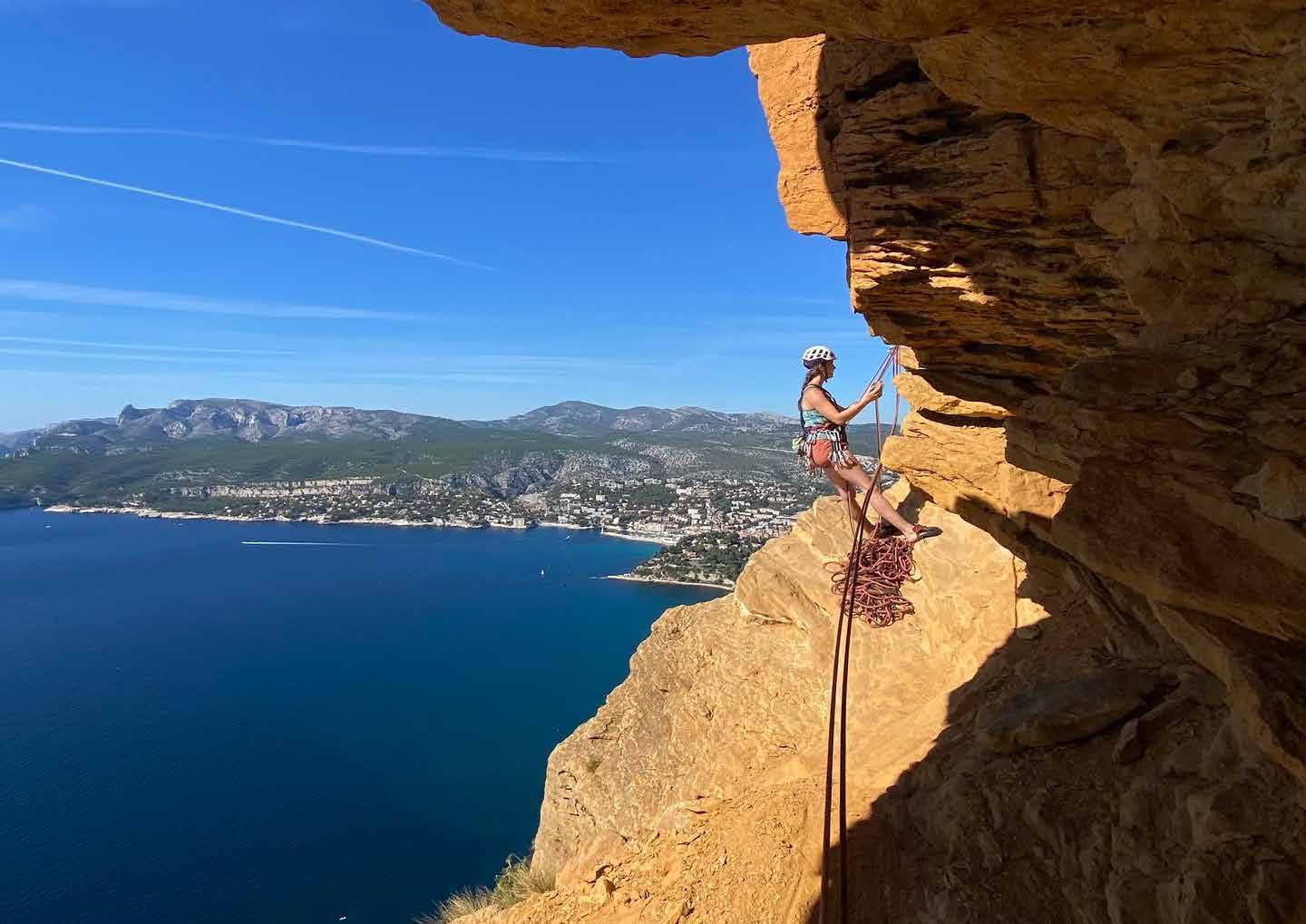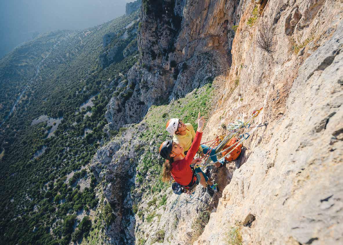 Manikia, Greece. Charlotte Durif and Anak Verhoeven enjoy a girls day as they navigate a sea of limestone on a multi-pitch climb, wearing SIROCCO helmets and AQUILA harnesses. It’s an all-day adventure, climbing until sunset and rappelling under the stars! © 2022 - Petzl Distribution - marcdaviet.com