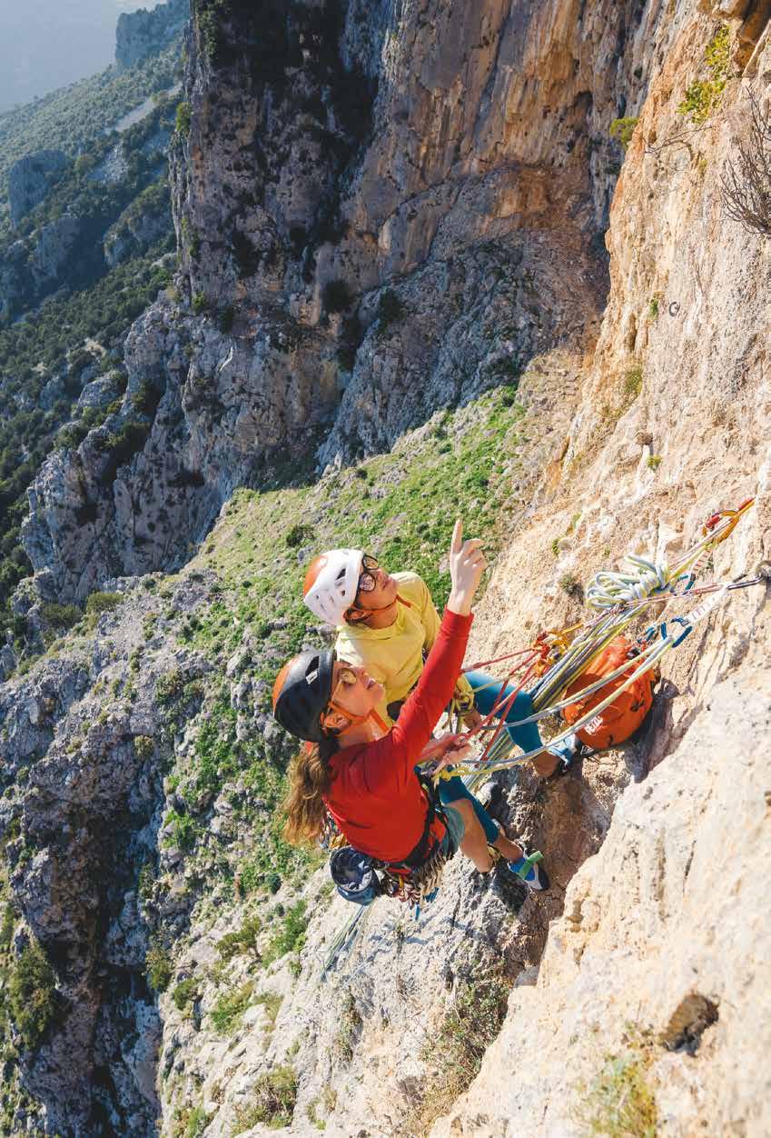 Manikia, Griekenland. Anak Verhoeven en Charlotte Durif bespreken de juiste route tijdens een multipitch beklimming op de kalksteen rotsen. Ze dragen SIROCCO helmen en een AQUILA harnas. Het was echt een top-dag, met klimmen tot zonsondergang en rapellen onder een prachtige sterrenhemel. © 2022 - Petzl Distribution - marcdaviet.com