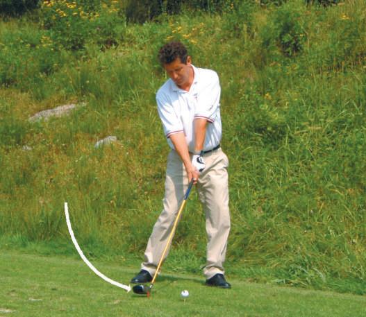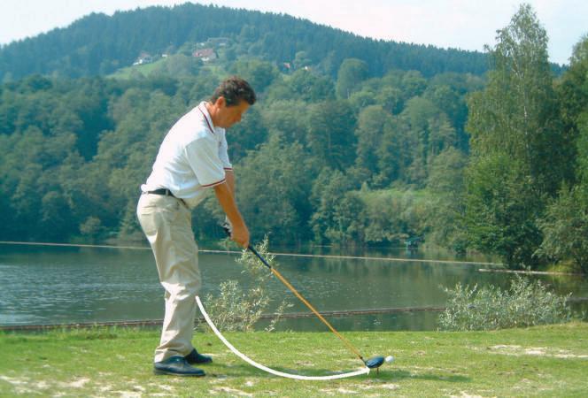 Beim Schwung hinab versuchen Sie, dieses zweite Tee zu köpfen,bevor Sie den Ball treffen. Mit dieser Übung stellen Sie sicher, dass Sie mit dem Schläger von innen an den Ball kommen und die Schlagfläche leicht geschlossen ist. Das ist die Formel für mehr Weite und eine bessere Kontrolle. Der Schlag wird damit zu einem langen Draw,das heißt,der Ball beschreibt einen Bogen von rechts nach links und bekommt einen weiten Auslauf. Also,alles Gute beim Üben! ■