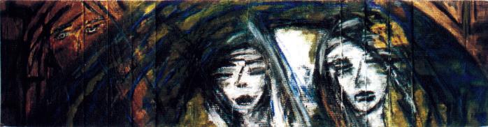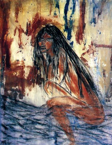 Der menschliche Körper,mit monumentaler Wucht die Leinwand beherrschend,war zentrales Thema der Arbeiten aus den achtziger Jahren.Aus dieser Zeit stapeln sich noch riesenformatige,gerollte Leinwände auf dem Boden ihres Wohnateliers. Das Motiv der Frau wird immer in neuen Varianten ausprobiert. IhreAkte sind nicht nackt,trotz aller spürbaren Sinnlichkeit bleiben sie eingehüllt,von einer letzten Unantastbarkeit. Sie verzichtet auf jegliche Charakterisierung der Person durch Umgebung oder differenzierte Physiognomie. Ihre zu Chiffren und Kürzeln erstarrten Gesichter vermitteln das Gefühl existentieller Bedrohung und Visionen innerer Wildnis. Diese Bilder haben ein brutales Element:in der Struktur,im Detail zer-
