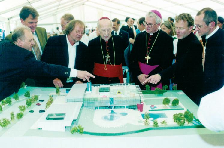 v.l.n.r.: Bgm. Franz Buchegger, LAbg. Erwin Dirnberger, LR Dr. Kurt Flecker, Kardinal Dr. Franz König, Weihbischof Dr. Franz Lackner, Stadtpfarrer Mag. Wolfgang Posch und Superior Pater Karl Schauer sind vom Modell begeistert.