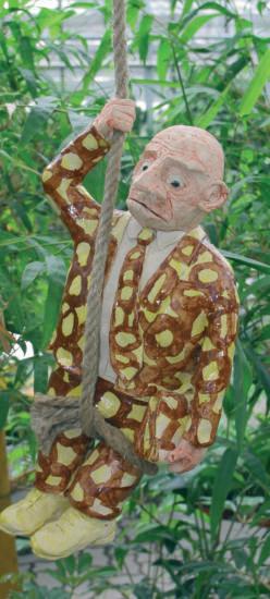 – es handelt sich dabei um die Gewächshäuser der Gärtnerei Baumgartner,die sich in der Nachbarschaft zum Steinfeldfriedhof befinden. „Es ist die perfekte Umgebung für meine Arbeiten“,schwärmt der meist eher grantig und grimmig wirkende Jurist. Die Ideen und Bilder für seine Figuren trägt er bereits im Kopf. Er arbeitet sie in der Folge in seinem Atelier aus, die Skulpturen aus Ton sind innen hohl. Dieser wird bei 1.200 Grad Hitze gebrannt und „sie sind daher auch winterfest“ (Schwentner). Das Modellieren, Zeichnen ist für den Richter Erich Schwentner,Jahrgang 1945,ein Ausgleich zu seiner „staubtrockenen Gesetzesarbeit“,wobei er im Laufe der