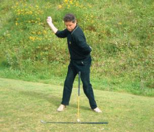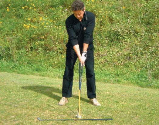 damit der Schläger frei „läuft“: Den Schläger fünf Zentimeter tiefergreifen,dannerwartetman keine besondere Länge mehr, dadurch bleibt man locker,man greift langsam höher bei den Übungsschwüngen und kommt damit zum gewünschten lockeren Schwung. ■
