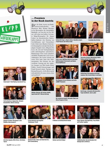 ... Premiere in der Bank Austria ass die Bank Austria mit BankAustria-Landesdirektor und Hausherrn Mag. Helmut Birringer in der Herrengasse die ehrwürdigste Bankhalle von Graz für ein Fest öff net, will schon was heißen. So konn te Klipp-Herausgeber Dr. Jürgen Lehner im klassizistischen Säulen hallen-Ambiente den Einstieg von Geschäftsmann und Unternehmer Carlo Arlati einer illustren Gästerun de bekanntgeben und gleichzeitig die jüngste Ausgabe seines „Magazins für Leser, die sich mit Vordergründigem nicht zufriedengeben“ präsentieren. Bankmanager Peter Lazar plauderte als Hobby-Triathlet über seine Grenz erfahrungen. Die Lacher absolut auf seiner Seite hatte dann aber Stim menimitator Alex Kristan, der das exzellente Catering mit den stärks ten Ansagen von Niki Lauda, Heinz Prüller, Arnold Schwarzenegger und Frank Stronach würzte. Topsager von Kristan/Stronach: „Geld allein macht nicht glücklich. Es muss einem schon auch gehören!“
