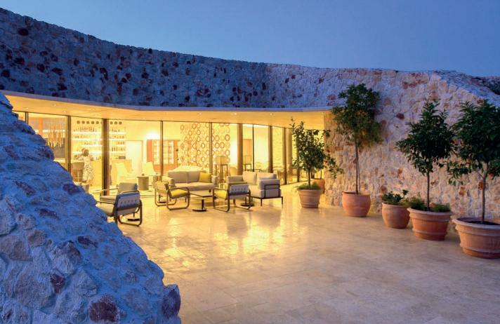 Die acht Suiten und Zimmer sind vollständig im Hügel eingebettet. Die zwei Restaurants und der Verkostungsraum für die Olivenöle bilden das Herzstück im Inneren. Nur die riesigen Terrassen bilden sozusagen die Verbindung zur Außenwelt. Die hohen Mauern und Gänge im Inneren sorgen für ein entsprechend angenehmes Klima, selbst wenn es draußen bis zu 40 Grad in der Sonne hat.