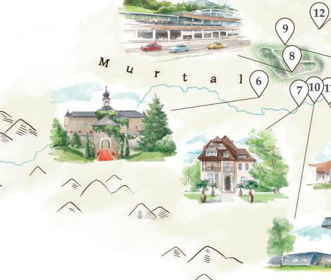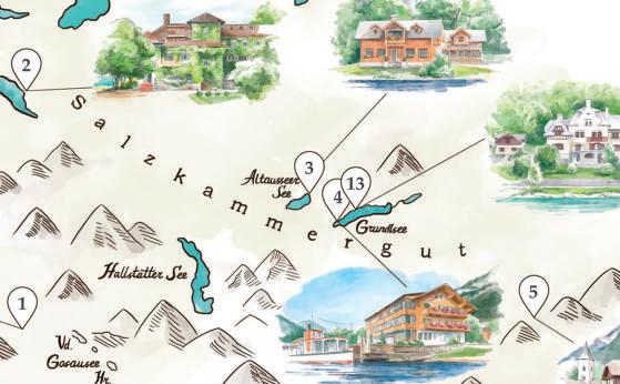 (8), das Landhotel Schönberghof (9), das Café Wasserturm (10), das G’Schlössl Murtal (11), der Hofwirt in Seckau (12). Wer weiter nach Norden reist, in die Region Salzkammergut, der kann sich in den Gästehäusern der Greißlerei Krenn in Trautenfels (5) erholen, am Seehotel Grundlsee (4), der Seewiese Altaussee (3), im Landhaus zu Appesbach (2). Und auch am Familiensitz von Didi Mateschitz in der Region Salzburg gibt’s attraktive Stopps, wie den Hangar 7, das Winterstellgut (1) oder Bull’s Corner. Bei einem Abstecher in die Südsteiermark gibt’s die Residenz Kittenberg (14). Wer es ganz zurückgezogen haben will, der sucht die Villa Anna am Grundlsee (13) auf oder zum Plantschen die Aqua Lux Therme in Fohnsdorf (nun auch in „Didis Reich“).
