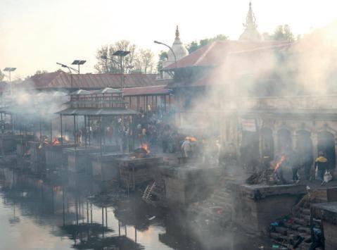 Der Tempel Pashupatinath und die riesige Buddha-Anlage sind das hinduistische und das buddhistische Gesicht von Kathmandu. Wobei der Tempel Pashupatinath einer der wichtigsten Pilgerstätten des Hinduismus ist. Gott Shiva wird hier als „Gott des Lebens“ verehrt. Und so verwundert es nicht, dass das Betreten des eigentlichen Tempels den Hindus vorbehalten ist. Am Fluss Bagmati, der die Tempelanlage durchläuft, ist die Luft erfüllt von den zahlreich gesprochenen Gebeten der Gläubigen, zu denen sich gelegentlich der süßliche Geruch von rituell verbrannten Toten gesellt.