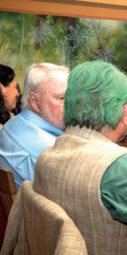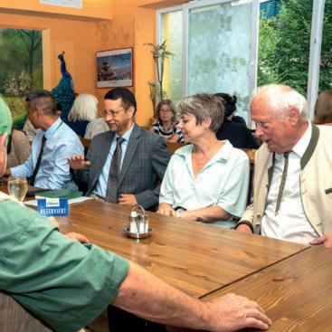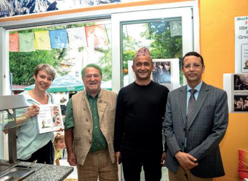 1 Brennnessel-Mann Franz Wuthe im passenden Outfit –grünes Haar, grünes Hemd und Brennnessel-Jacket – mit Botschafter Bharat Kumar Regmi 2 Himalaya-RestaurantEigentümer-Ehepaar Diamond und Kalpana Rai mit Jürgen Lehner 3 Gäste beim Durchblättern des BrennnesselBuches 4 Gemeinderätin Christine Braunersreuther in Vertretung von Bgm. Elke Kahr und