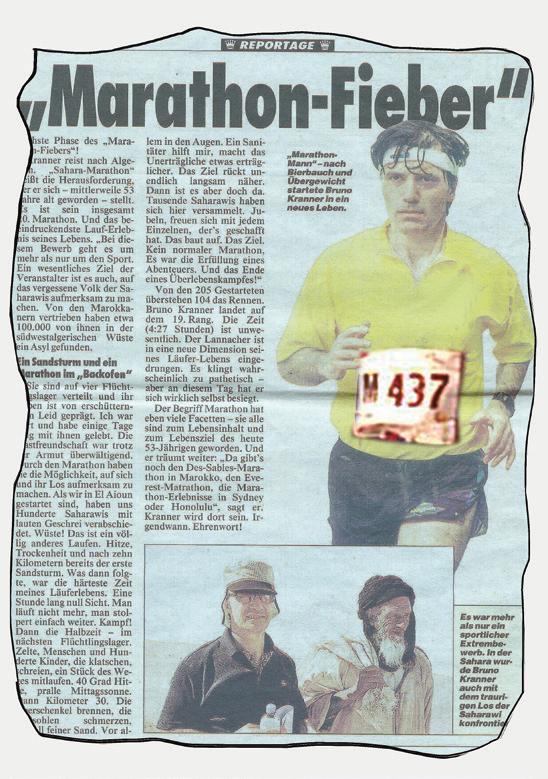 Sand in den Augen, Sand zwischen den Zehen „Das war das Härteste, was ich beim Laufen je durchgemacht und erlebt habe.“ So beschreibt Bruno Kranner seine Teilnahme am Sahara-Marathon. „Ich habe das mehr aus humanitären Gründen getan.“ Hunderttausende Sahrawis waren in den Süden von Algerien geüchtet und versuchten, dort ein neues Leben zu beginnen. Er war 2003 dort und bis heute gibt’s den Marathon. „Nach einer 14-Stunden-Anreise mit Flug, Bussen und Autos sind wir in der Lehmhütten-Stadt Smara gelandet. In der Dunkelheit, mit unseren Stirnlampen ausgestattet, sind wir zu unseren Gastfamilien geführt worden. Dort gab’s grünen Tee zur Begrüßung, geschlafen wurde in einem Zelt auf einer Matratze mit Decken. Die Nachttemperaturen waren empndlich – es ging bis auf fünf Grad