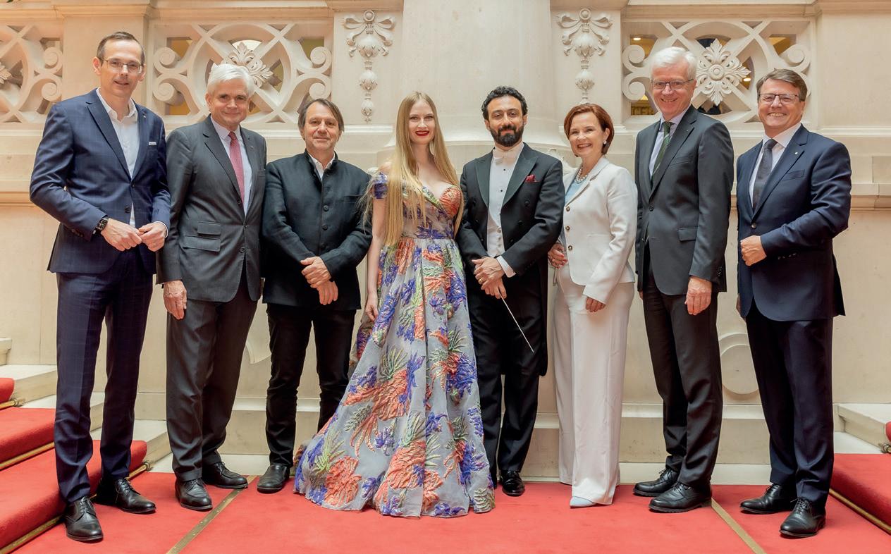 Dem Anlass entsprechend formiert. In der Mitte die Gäste: Recreation- und Styriarte-Intendant Mathis Huber (3.v.l.), Meisterpianistin Kristina Miller und Dirigent Fuad Ibrahimov. Und (v.l.): Vorstandsmitglied Oliver Kröpfl, Vorstandsvorsitzender Georg Bucher, Vorstandsmitglied Walburga Seidl, Neo-Privatier Gerhard Fabisch und der Neue im vierköpfigen Vorstand, Sigmund Loibner.