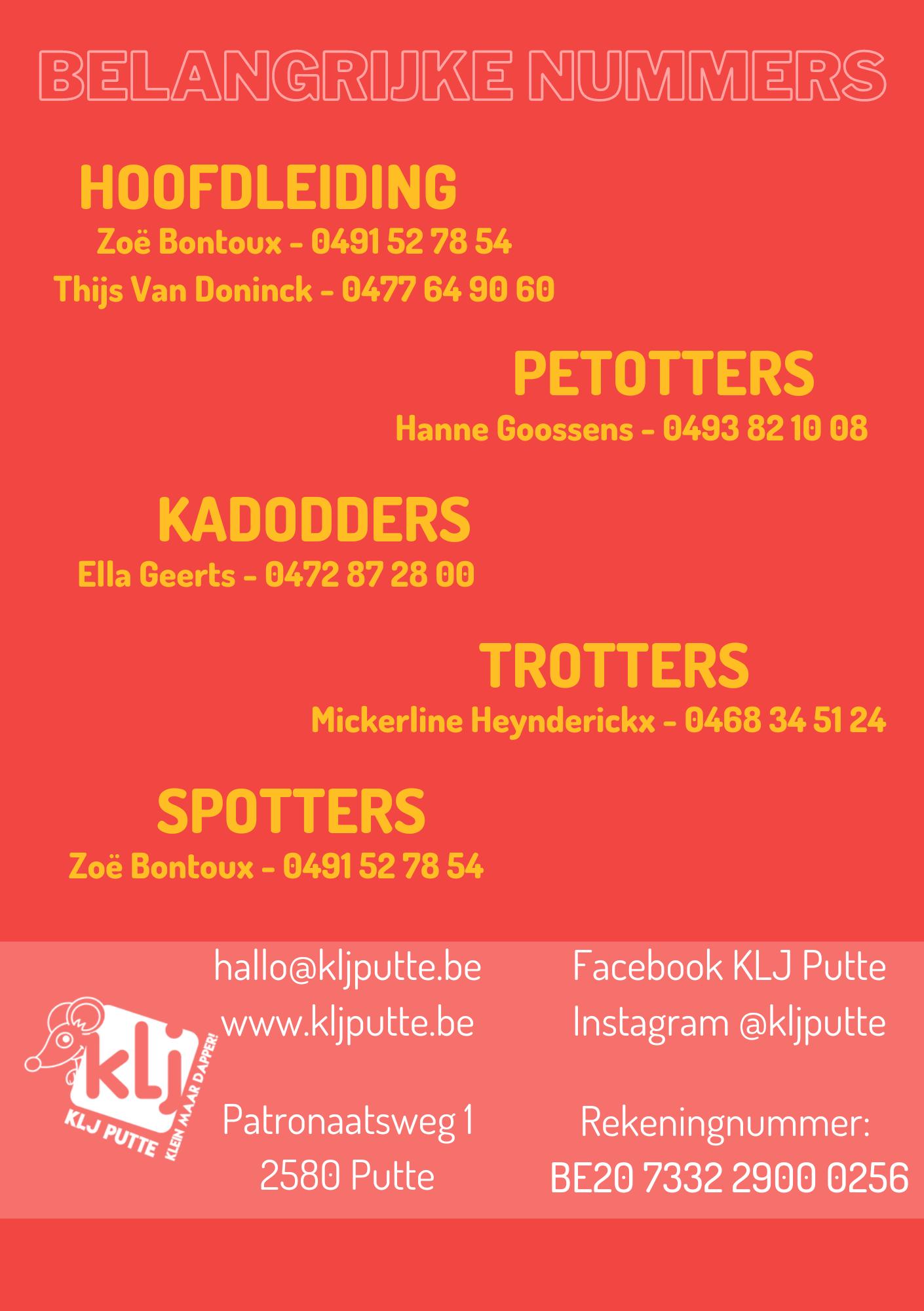 Ook de leiding is gedurende het kamp bereikbaar via GSM. De GSM-nummers van de leiding vind je achteraan op dit boekje. Laat ons wel duidelijk zijn: deze GSM-nummers worden enkel in nood gebruikt. Het is niet de bedoeling dat ouders om de haverklap bellen om te vragen hoe het met hun zoon / dochter gaat.