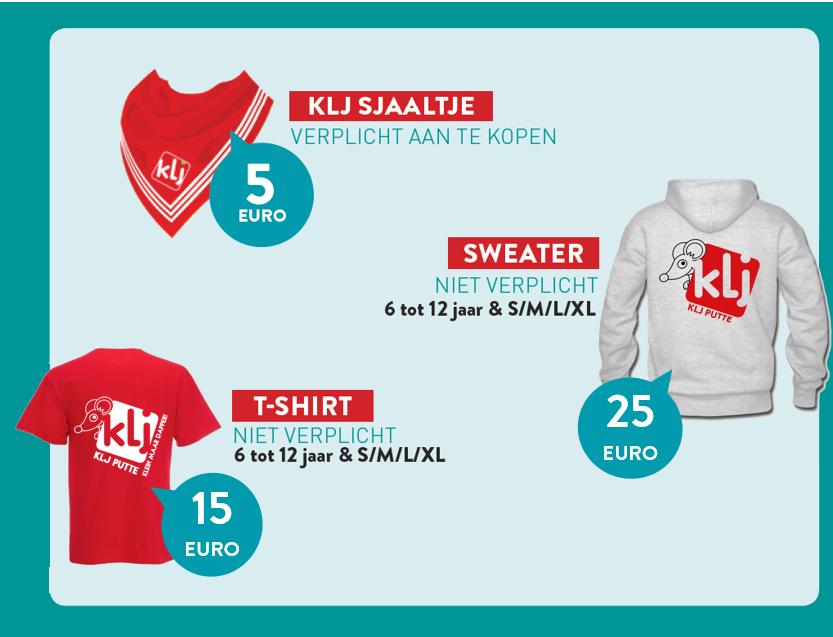 Met deze uniformkledij laat je zien dat je een échte KLJ’er bent! Tijdens de activiteiten is het KLJ-sjaaltje verplicht. Als je graag een Tshirt of trui van onze jeugdbeweging hebt, kan je deze aankopen.