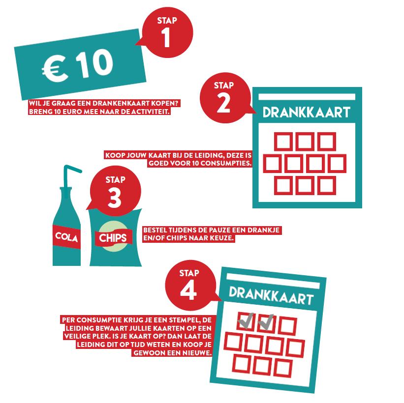 Tijdens elke activiteit pauzeren we even. Dan kunnen de leden een drankje of chips kopen in onze bar. We werken hiervoor met een systeem van drankkaarten. Ontdek hier hoe dit in zijn werk gaat!