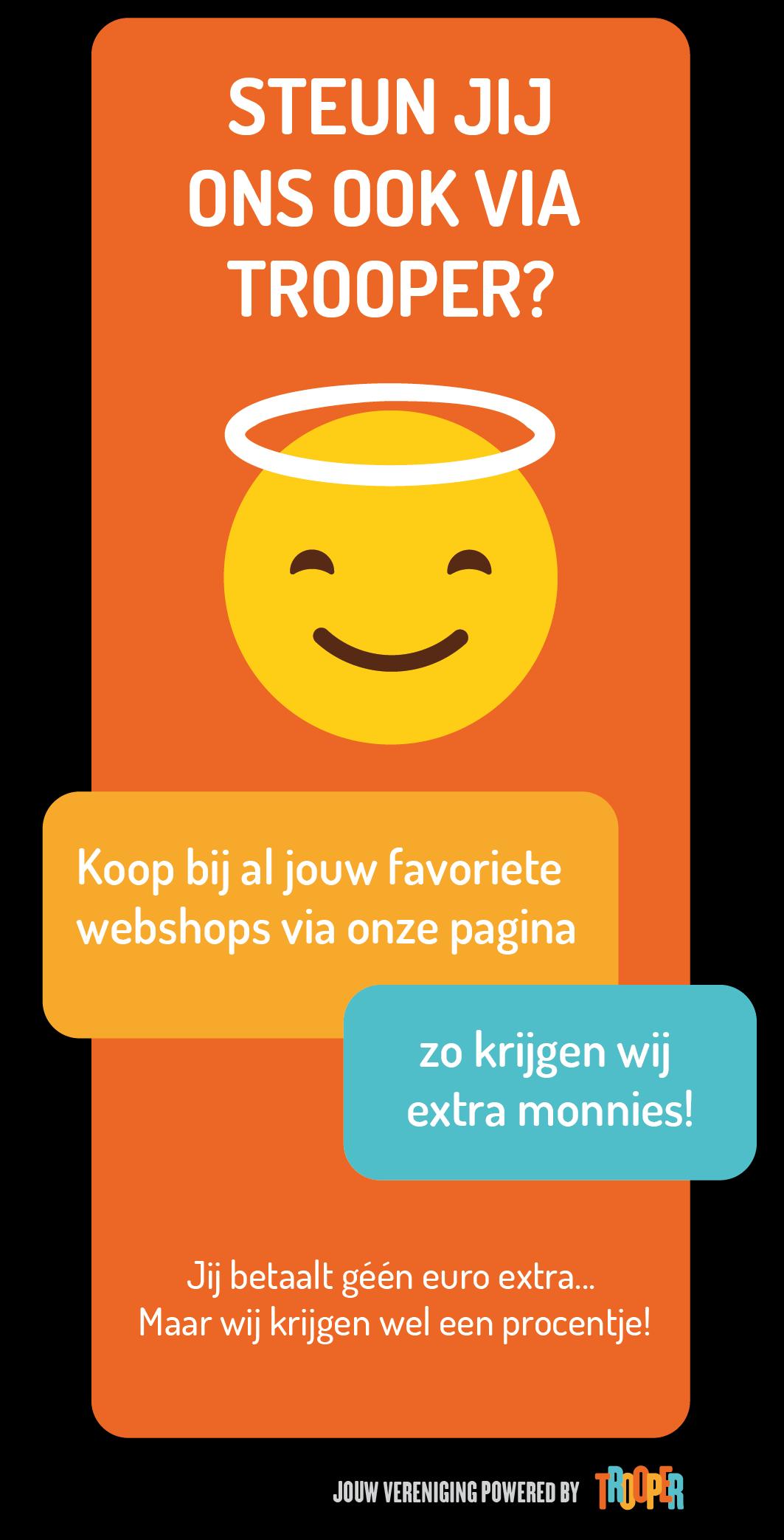 Wel, met Trooper kan jij onze kas spijzen door gewoon online te shoppen. Je betaalt exact dezelfde prijs als normaal, maar door via onze Trooperpagina naar een online shop te gaan, weet de shop welke vereniging jij wil steunen. Per aankoop van € 100, geeft de shop +/- € 5 aan ons.