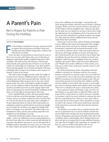 A Parent’s Pain Ken’s Hopes for Parents in Pain During the Holidays WRITTEN BY KEN KARLBERG