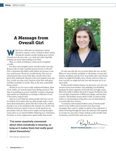 It’s also true that the way we look affects the way we feel. When we wear slouchy, wrinkled, or old clothes, we may feel slouchy, wrinkled, and old. If we wear bold colors and vibrant prints, we might feel bolder, more vibrant. And yes, when we wear overalls, we might feel safe, but only because we’re trying to hide. In this month’s fashion feature, we showcase cozy and cute sweaters from local retailers. Our publisher, Lisa Karlberg (perhaps the direct opposite of Overall Girl), lovingly assembled each outfit to display the kind of unique Northwest style you can find at businesses in Whatcom, Skagit, and San Juan counties. This holiday season, there’s really no need to shop online or visit boutiques in big cities; you can find whatever you need right here at home. As someone with minimal fashion sense, I found myself drawn to the clothes and accessories Lisa discovered (strangely, there wasn’t a single scrunchie in her collection). I admit, browsing through the items she selected, I felt inspired to revamp my own style. I hope, looking at this month’s fashion feature, you’ll feel the same way, too.