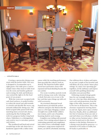 nature while the matching performance linen provided the cohesive look we desired. The luxurious leather upholstered host and hostess chairs with repeated nail head detailing became the eye-catcher. For room versaltity, neutrals work well for dining room walls. Selecting a shade that puts you at ease is the key and then spice things up with colorful accessories. An oversized, distressed wood framed mirror provided the perfect reflection and gives the illusion that the space is a bit larger. Hanging a rusted wrought-iron candle holder added a nice texture, and it cast a beautiful, haunting shadow each evening. Complete your styling with seasonal accents. I love mixing natural shapes in contrasting materials and complementary colors. Even a refreshingly simple centerpiece, using nature-inspired elements, can still be absolutely stunning.