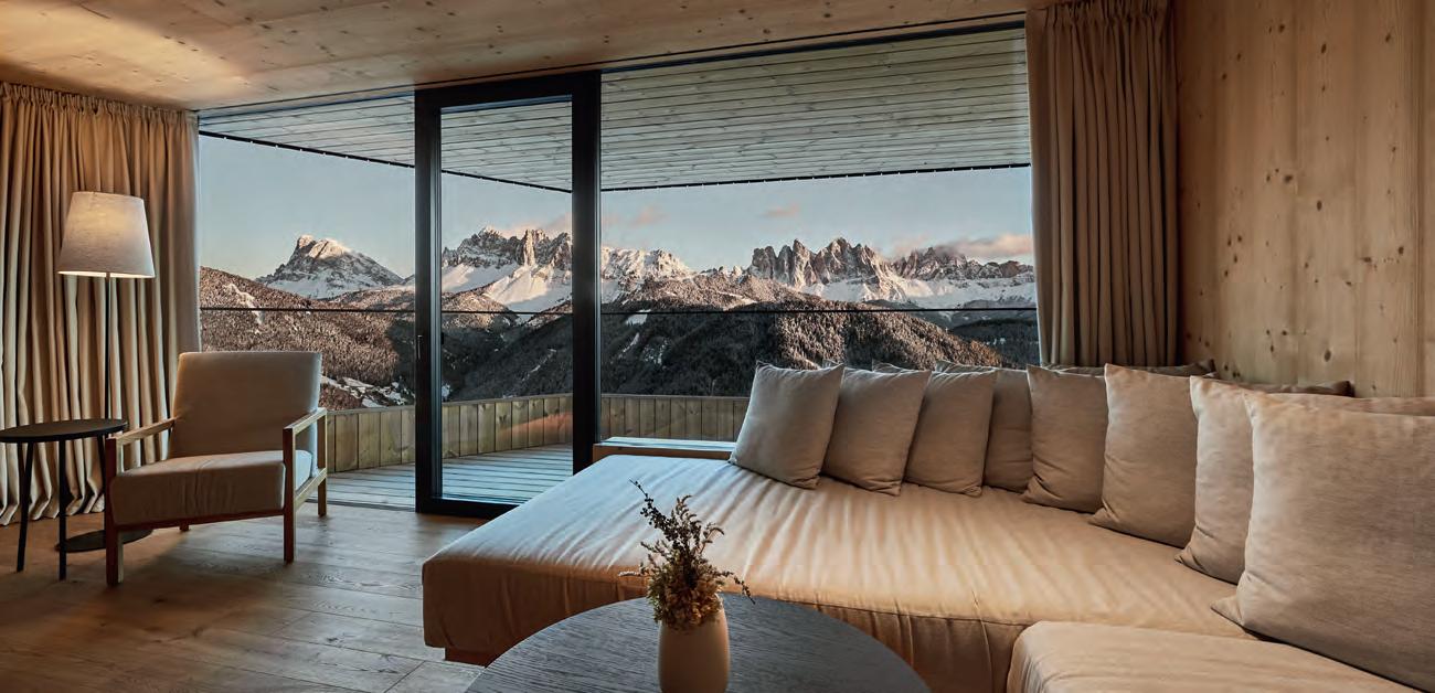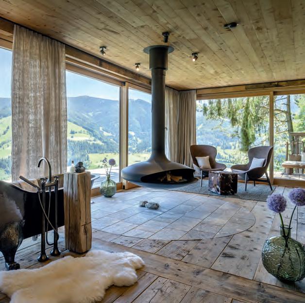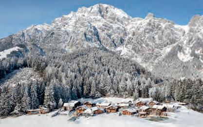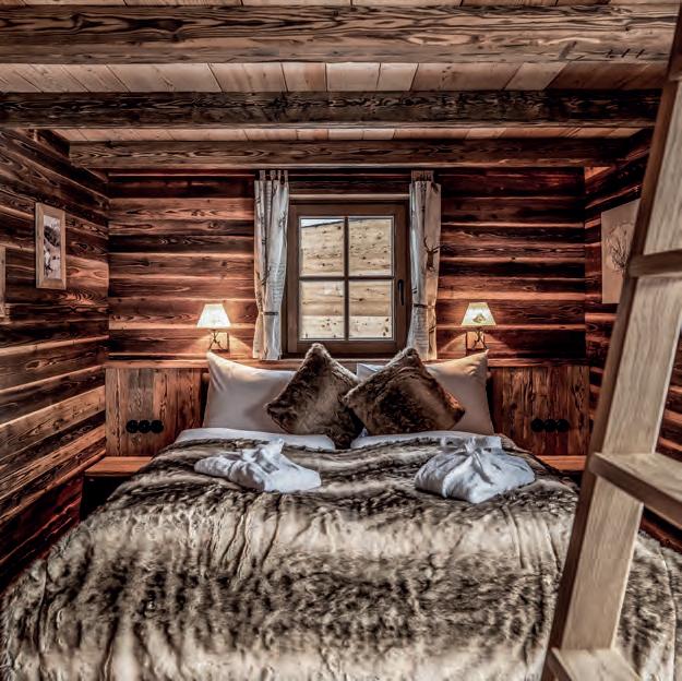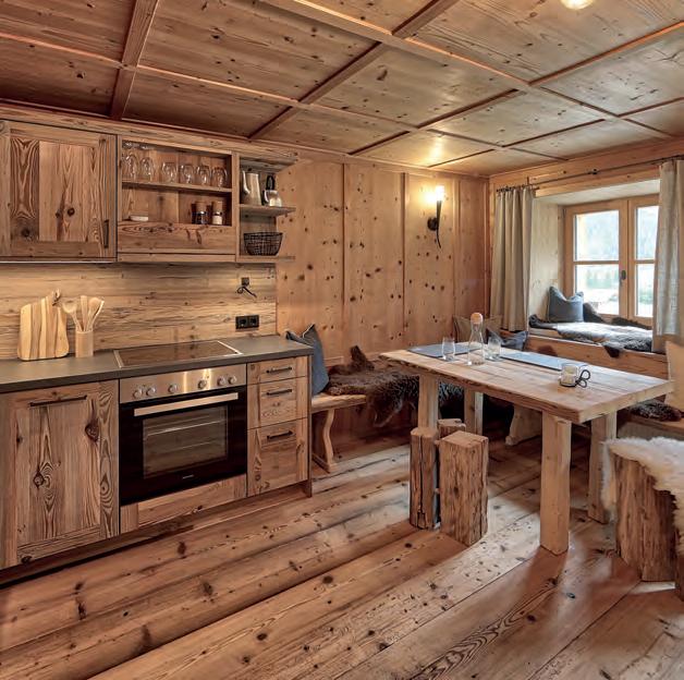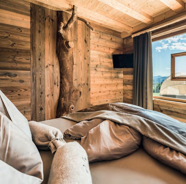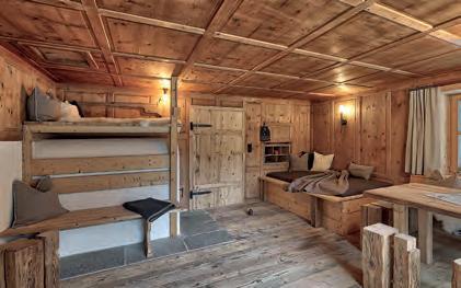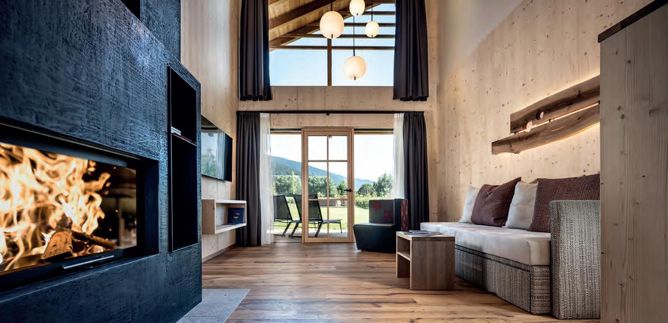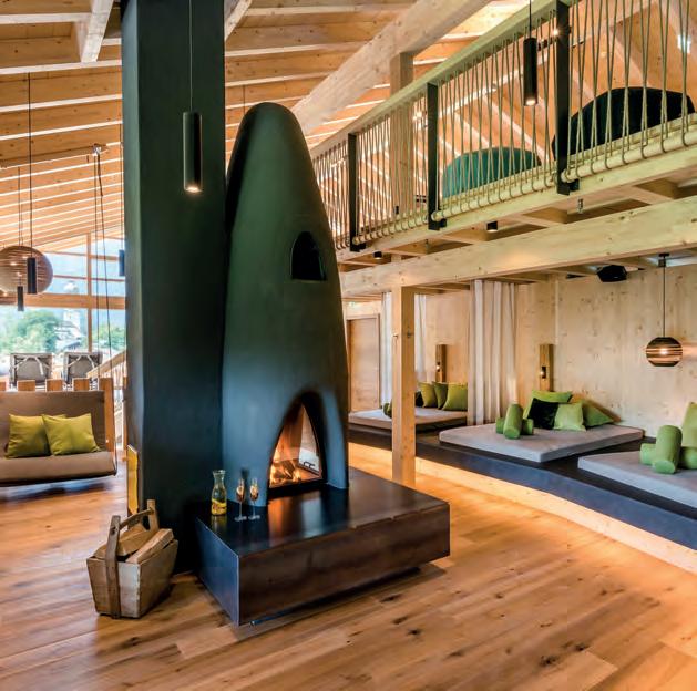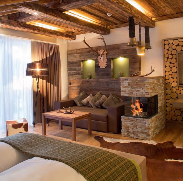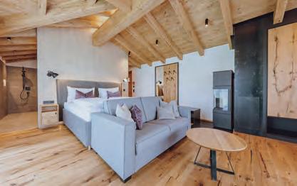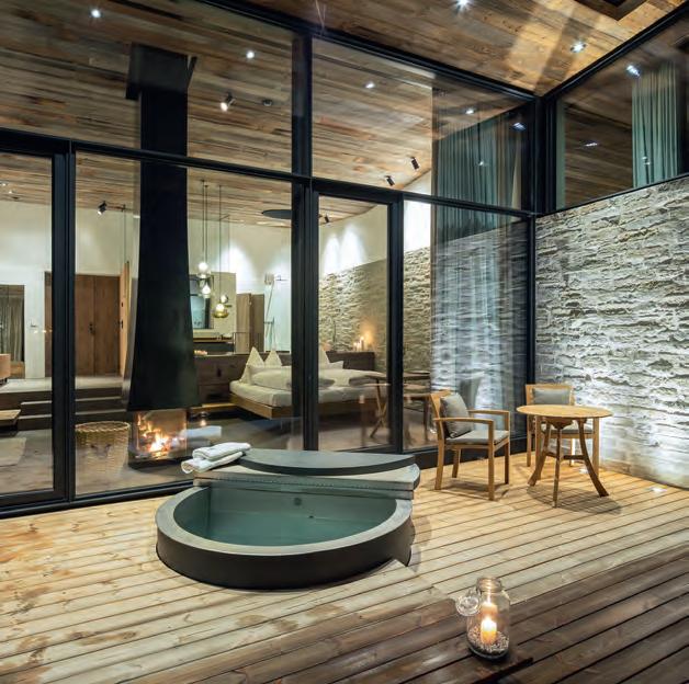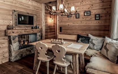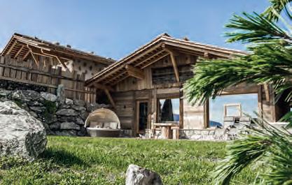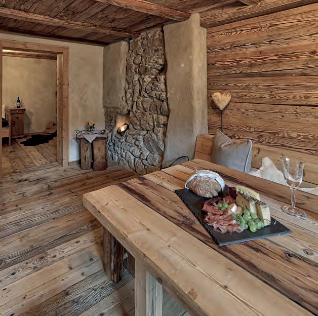 Ein Chalet-Resort nur für Erwachsene am Eingang zu den berühmten Grödner Dolomiten. Rosamunde und Walter und ihre drei erwachsenen Kinder haben im Bergdorf Lajen auf 1 000 m Seehöhe in einzigartiger Südlage ein 2 ha großes Urlaubsparadies erschaffen, das vor allem Paaren einen kostbaren Romantikurlaub beschert. Zur Auswahl stehen elf ChaletKategorien wie Lodges, ebenerdige Chalets und zweigeschossige Chalets inklusive Terrasse und Garten. Das Nonplusultra ist das weltweit einzige ReinholdMessner-Chalet mit persönlichen Einrichtungsmerkmalen des berühmten Bergsteigers. Alle Domizile wurden in Naturstein mit rustikalen Holzdielen und Steinbädern nach alter Handwerkskunst vom Hausherrn selbst geplant und eingerichtet. Raumhohe Glasfronten holen die Natur in die Wohnräume, die über eine komplett ausgestattete Wohnküche verfügen. Ein romantischer Kamin lädt zum Entspannen ein.