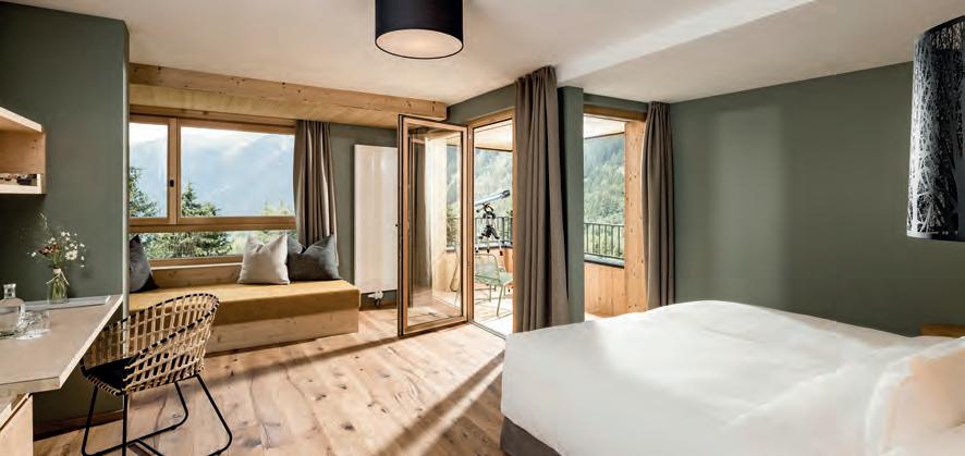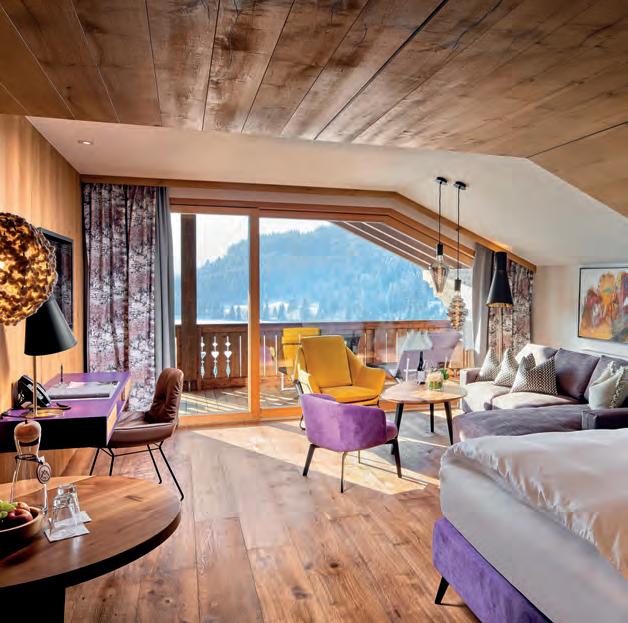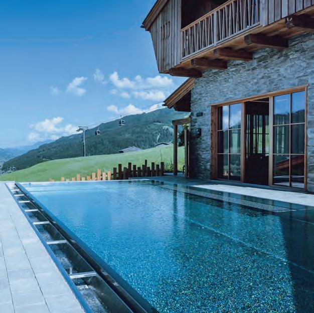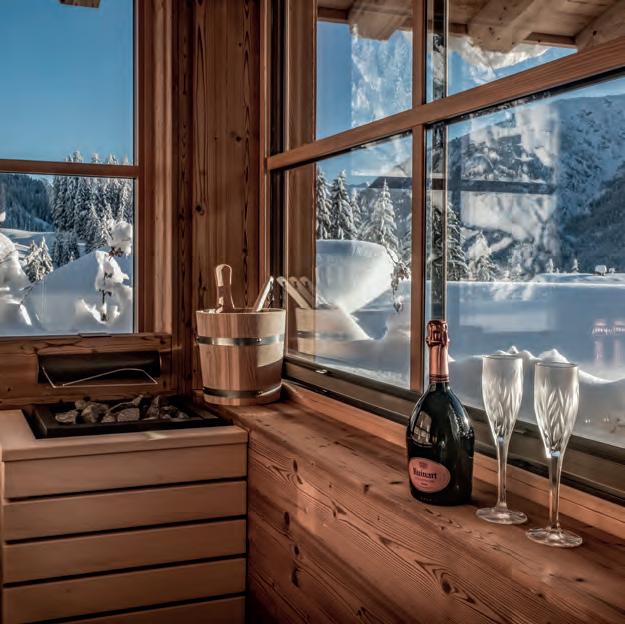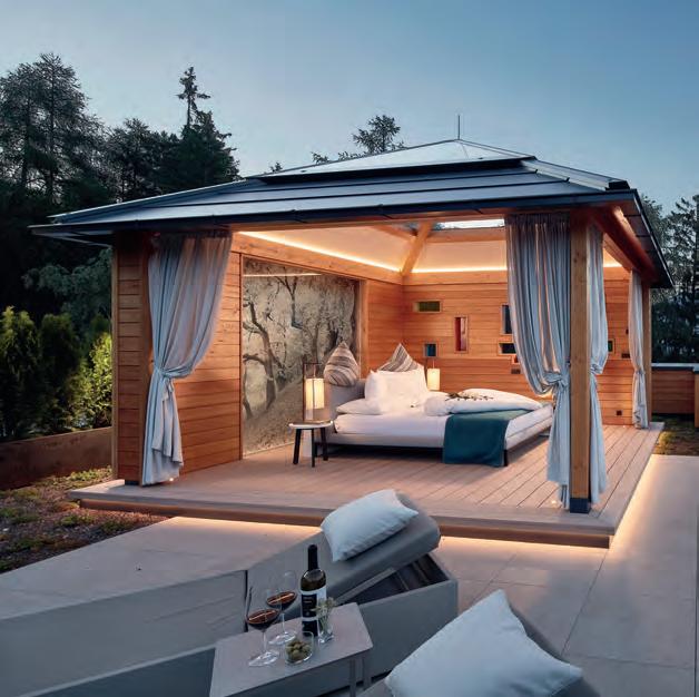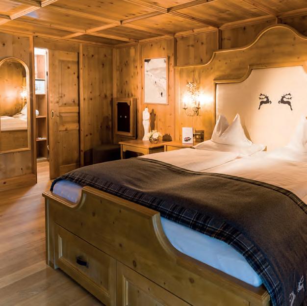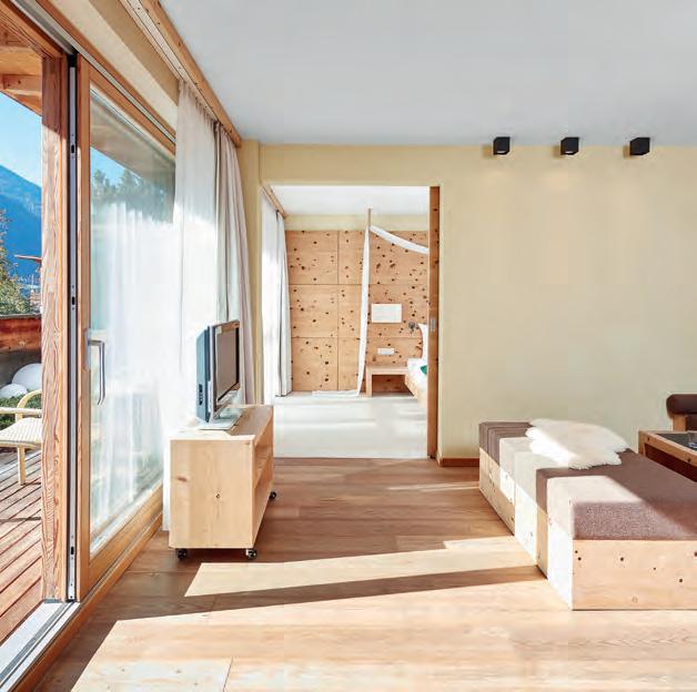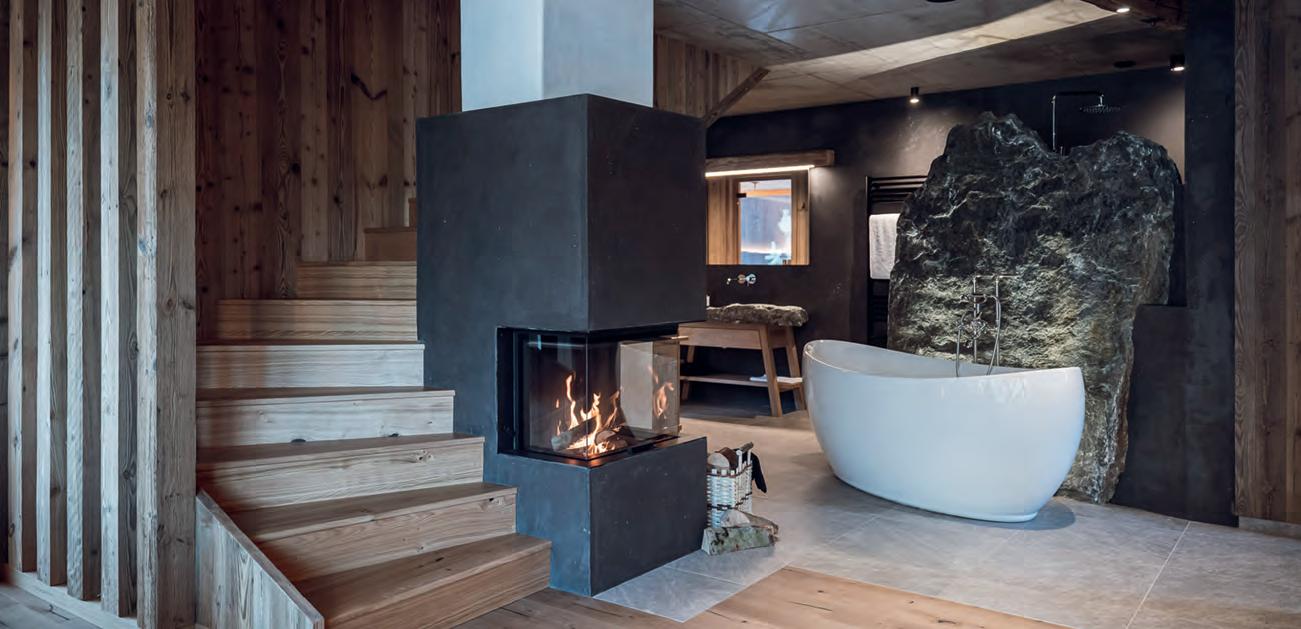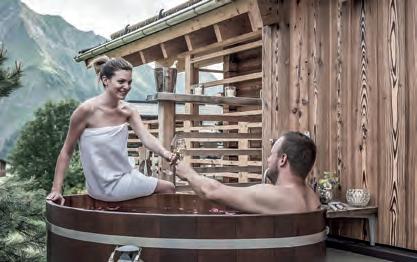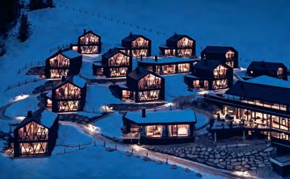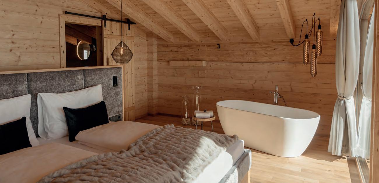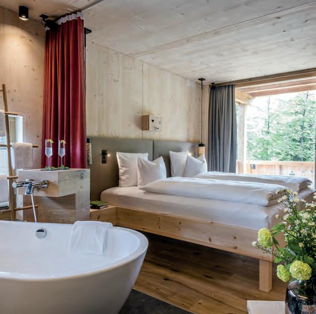 Ein Chalet-Resort nur für Erwachsene am Eingang zu den berühmten Grödner Dolomiten. Rosamunde und Walter und ihre drei erwachsenen Kinder haben im Bergdorf Lajen auf 1 000 m Seehöhe in einzigartiger Südlage ein 2 ha großes Urlaubsparadies erschaffen, das vor allem Paaren einen kostbaren Romantikurlaub beschert. Zur Auswahl stehen elf ChaletKategorien wie Lodges, ebenerdige Chalets und zweigeschossige Chalets inklusive Terrasse und Garten. Das Nonplusultra ist das weltweit einzige ReinholdMessner-Chalet mit persönlichen Einrichtungsmerkmalen des berühmten Bergsteigers. Alle Domizile wurden in Naturstein mit rustikalen Holzdielen und Steinbädern nach alter Handwerkskunst vom Hausherrn selbst geplant und eingerichtet. Raumhohe Glasfronten holen die Natur in die Wohnräume, die über eine komplett ausgestattete Wohnküche verfügen. Ein romantischer Kamin lädt zum Entspannen ein.