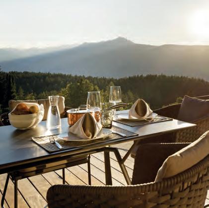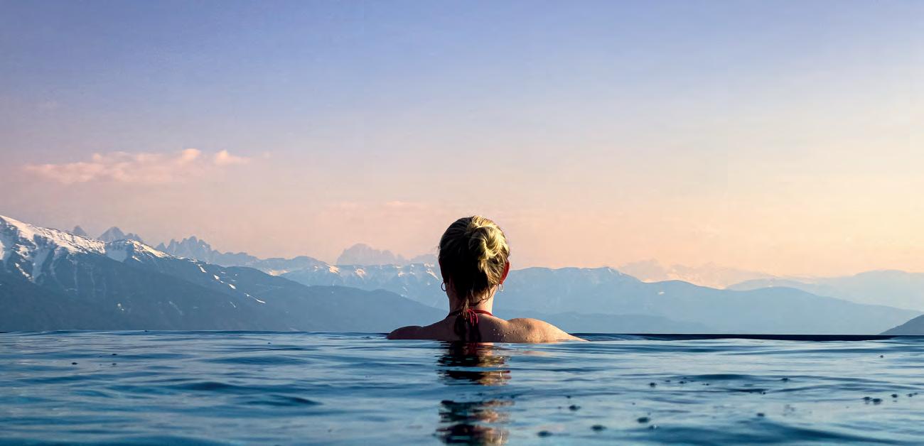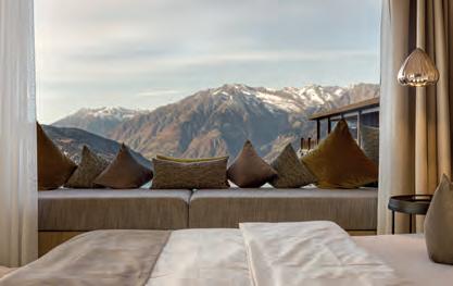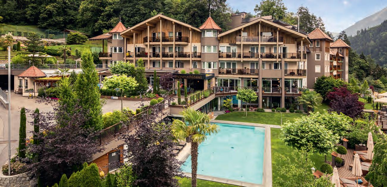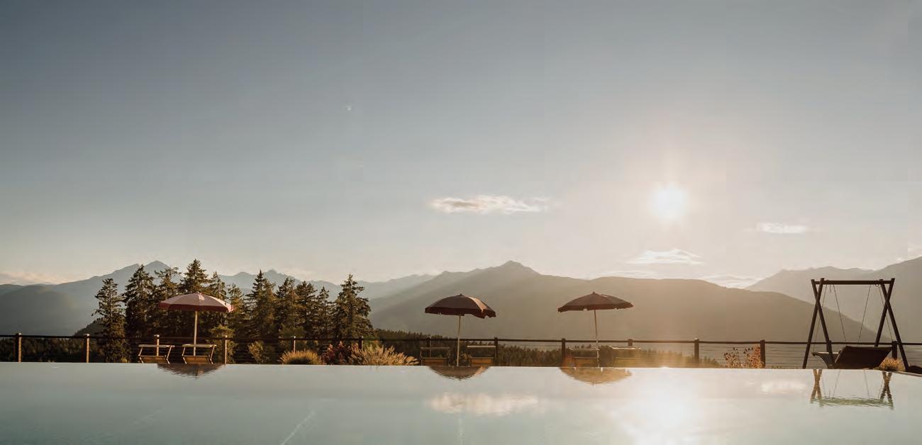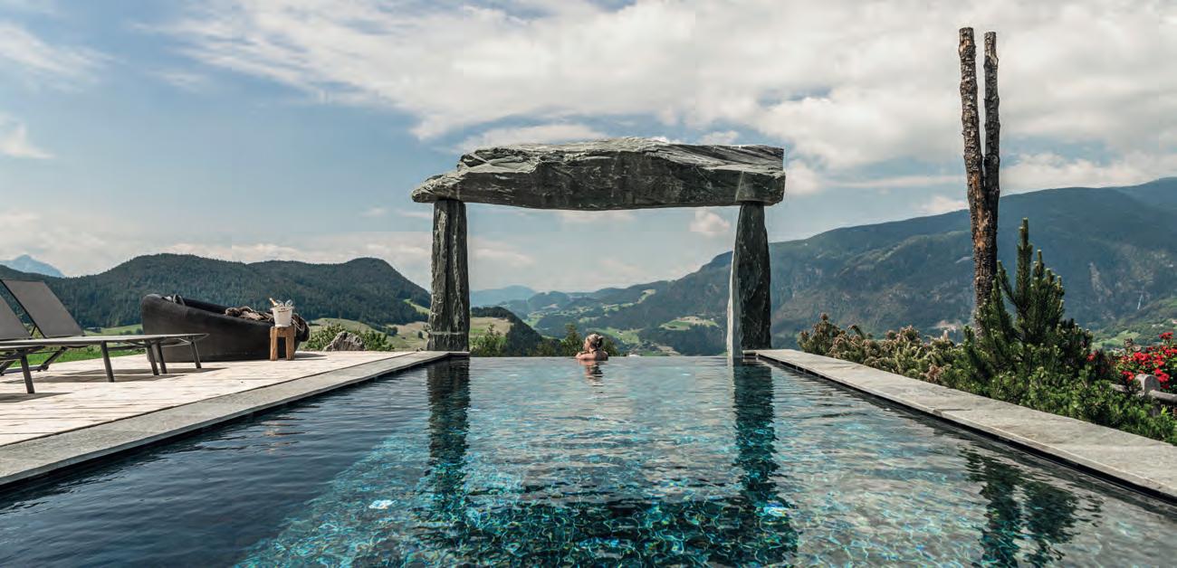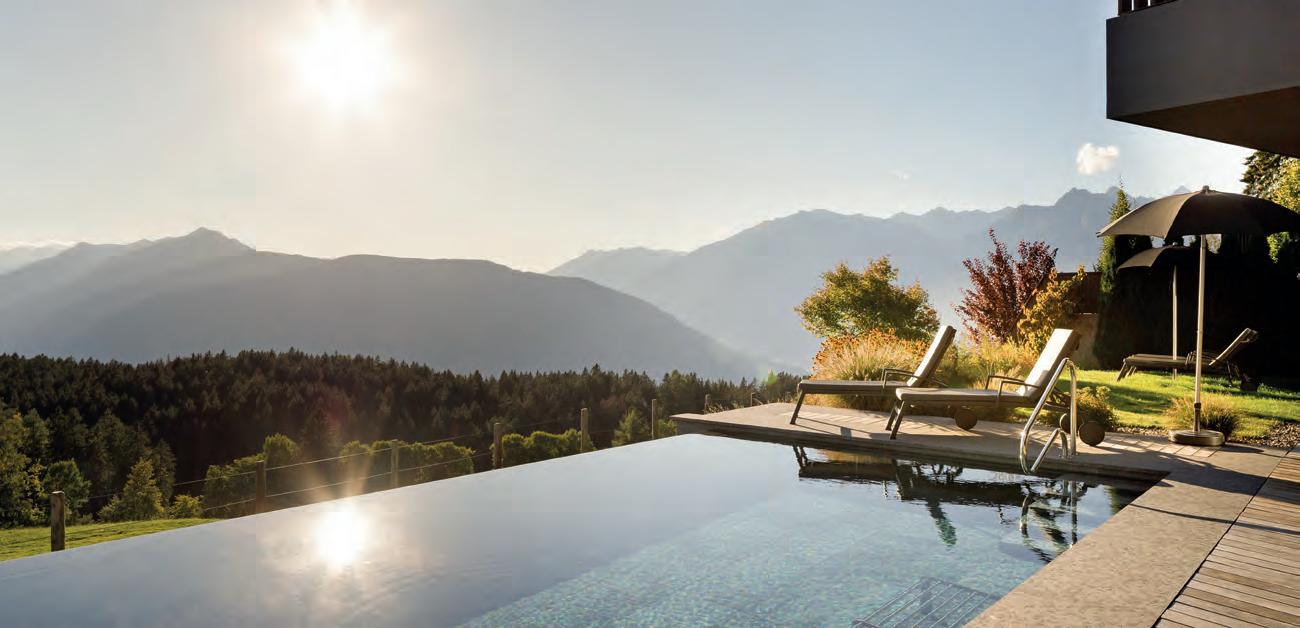 Auf einer Höhe von 1 500 Metern zwischen Pustertal und Eisacktal liegt am sonnenverwöhnten Hochplateau des Bergdörfchens Meransen das luxuriöse Vier-Sterne-Superior-Refugium Tratterhof Mountain Sky Hotel. Aus dem einst kleinsten Bauernhof des Ortes schuf die sympathische Gastgeberfamilie Gruber-Hinteregger eines der schönsten Domizile Südtirols. Schon allein die individuelle Terrassenbauweise vermittelt das Gefühl von Freiheit am Berg. Hier hoch oben ist man Panorama-Spezialist, denn die Dolomiten scheinen zum Greifen nah. Aus den Zimmern mit Balkon und Suiten mit Terrasse genießt man unendlichen Weitblick nach Süden. Die Küche ist eine gelungene Symbiose aus traditioneller Südtiroler Kochkunst und mediterranen Köstlichkeiten. Die charmante Seniorchefin bietet Kochkurse an und verrät gern die Geheimnisse der Knödelkunst. Gastgeberin und Dipl.-Sommelière Evelyn präsentiert bei den wöchentlichen Verkostungen die edelsten Tropfen aus dem opulenten Weinkeller. Zu den Highlights des Hauses zählt eine der höchstgelegenen Wellnesslandschaften Italiens. Die Gäste erleben Entspannung pur im 4 000 Quadratmeter großen Monte Silva Mountain SPA mit Saunen, Infinity-Pools, Massagen, Fitness und Beauty-Farm. Das vielseitige Wochenprogramm für aktive Gäste inklusive Höhenwanderungen mit Gastgeber Andreas bietet Abwechslung für jeden Geschmack. Yoga- und Mentalwochen mit renommierten Referenten runden das Sky-WellnessAngebot ab. Urlaub vom Feinsten ist hier garantiert.