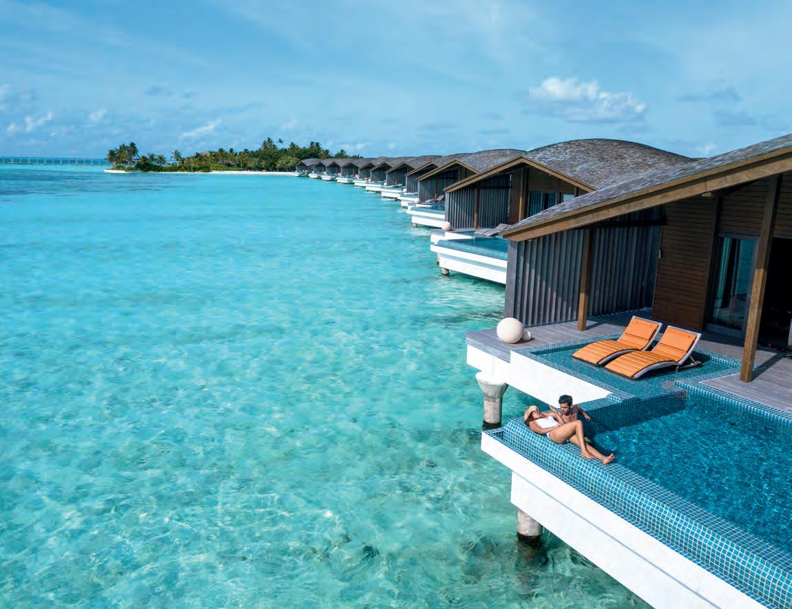 The seaplane flight from Velana International Airport in Malé to the sheer tropical paradise of Vagaru Island takes around 55 minutes. Scattered around the tiny island, which exudes an air of authenticity, are 29 Beach Villas and 31 Overwater Villas; spanning 234 to 285 square metres, they epitomise the dream of holiday romance. Having received a warm greeting and completed check-in formalities, guests are accompanied to their accommodation. For the fixtures and fittings in the villas, the emphasis was clearly on natural tones and high quality materials that would blend easily into the environment. All options come with private pool, spacious wooden terrace and state-ofthe-art multimedia equipment, while floor-toceiling windows frame unobstructed views of the turquoise waters of the Indian Ocean.