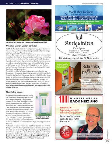 Mit allen Sinnen Garten genieĂ&#x;en Im Mai laufen Gartenliebhaber zu Hochform auf, denn der Garten hat sein Kleid aus frischem GrĂźn Ăźbergestreift. Der Rahmen ist geschaffen, um farbige Akzente zu setzen. Wer die Zeit nutzen und seinem GartenglĂźck näher kommen mĂśchte, sollte in der Osdorfer Baumschule Johs. Wortmann vorbeischauen. Denn hier ist die Sommerblumensaison erĂśffnet. Neben den legendären Wortmann-Blumenampeln und exklusiven Geraniensorten blĂźhen exotische SchĂśnheiten wie Schmucklilie, Seidenblume und Oleander um die Wette. Auch Rhododendren und Azaleen stehen frisch vom Wortmann-Acker bereit, und kĂśnnen bis in den Juni hinein gepflanzt werden. Trend 2011 sind Duftpflanzen. Kräuter, aber auch GehĂślze wie Scheinbuche, Schneeball oder Flieder verstrĂśmen betĂśrenden Duft. NatĂźrlich darf auch die KĂśnigin der Blumen nicht fehlen. Die Rosensaison ist erĂśffnet und mit ihr eine spannende Aktionszeit. Am 18. Juni lädt Wortmann beispielsweise zum Rosenfest, bei dem geschaut, gerochen und geschmeckt werden darf. Ab 11 Uhr gibt es auĂ&#x;erdem einen kostenlosen Vortrag (Anmeldung erforderlich). Johs. Wortmann Pflanzen Gartenbedarf, Am Osdorfer Born 52, Telefon: 80 45 00