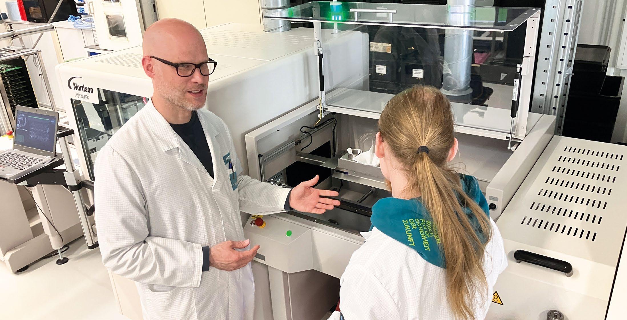 Philipp Krone zeigt in die Maschine vor sich: „Gerade fertigen wir eine Leiterplatte für eine beheizte Bodenplatte. Sie ist Teil eines Passagierflugzeugs von Airbus.“