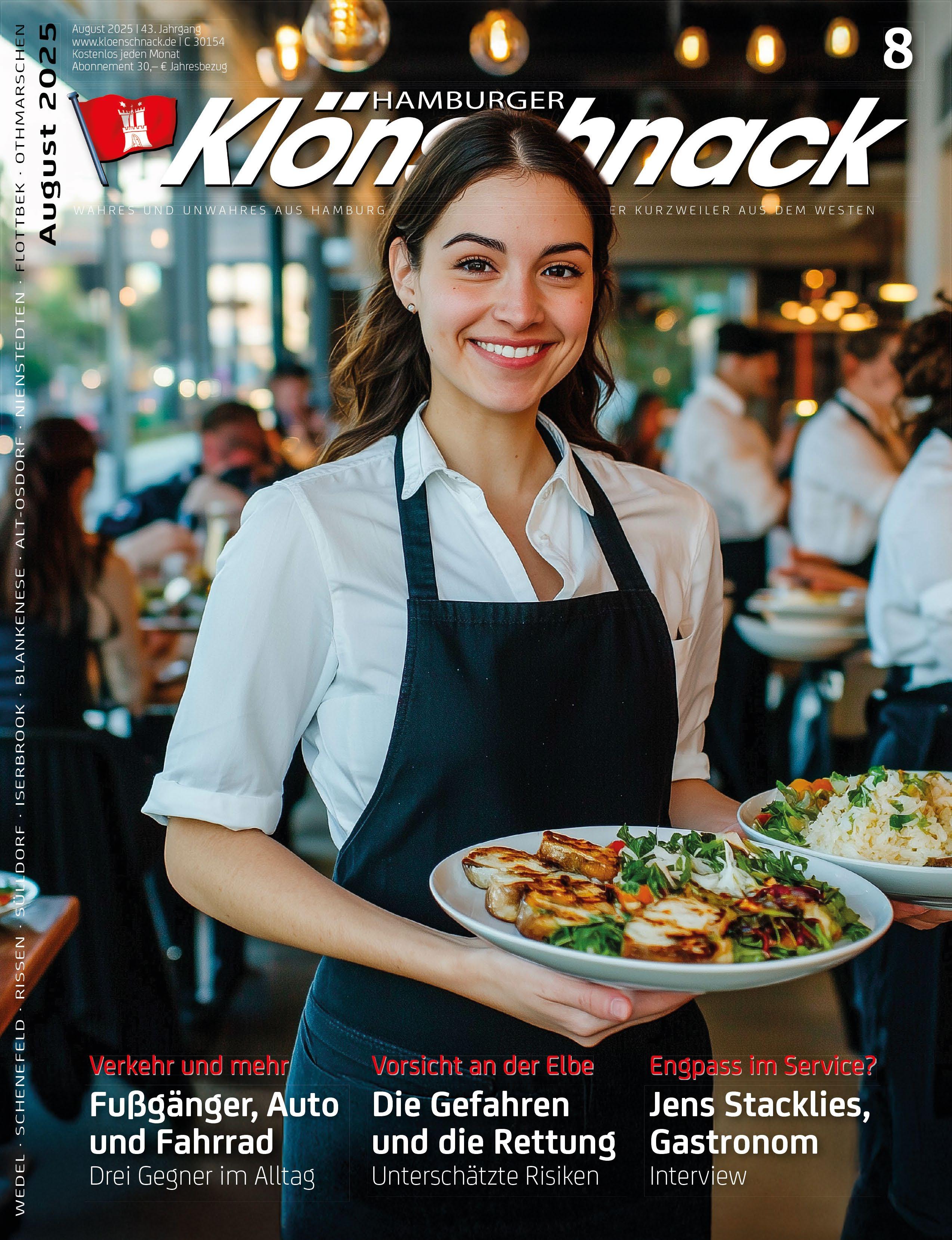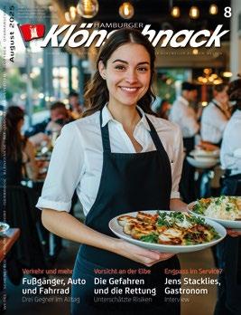 Haushaltsverteilung: FUNKE Logistik Hamburg GmbH Telefon 040 86 66 69-0, info@kloenschnack.de Klönschnack digital Internet: Michael Wendland (-14), michael.wendland@kloenschnack.de E-Paper über www.kloenschnack.de, auf Facebook, Instagram und mit Sonderbeiträgen über Youtube (Hamburger Klönschnack) Jahresabonnement Jahresbezugspreis 30 Euro innerhalb der Bundesrepublik Deutschland, europäisches Ausland/Übersee 72 Euro (inkl. MwSt., Zustellgebühr). Der Klönschnack erscheint monatlich zum Anfang eines Monats. Abonnementbetreuung und Leserservice empfang.sekretariat@kloenschnack.de