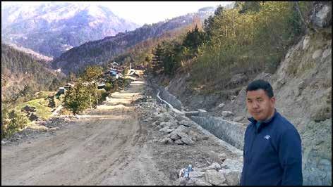 Busturen fra Salleri til Kathmandu tager omkring 14 timer og skal langt sydpå, før der kan drejes vestpå. Efter en hel dag hos Teknisk Forvaltning i Skive, blev han gjort meget opmærksom på betydningen af vandafledning for en vejs stabilitet. Nu er han næsten færdig med at bygge genvejen direkte vestpå, som kan afkorte køreturen med 3 timer. Det har ingen turdet tænke på før, for vejen skal op over to høje pas med ustabile skråninger, så nu har han bygget solide kanaler, før vejen bliver
