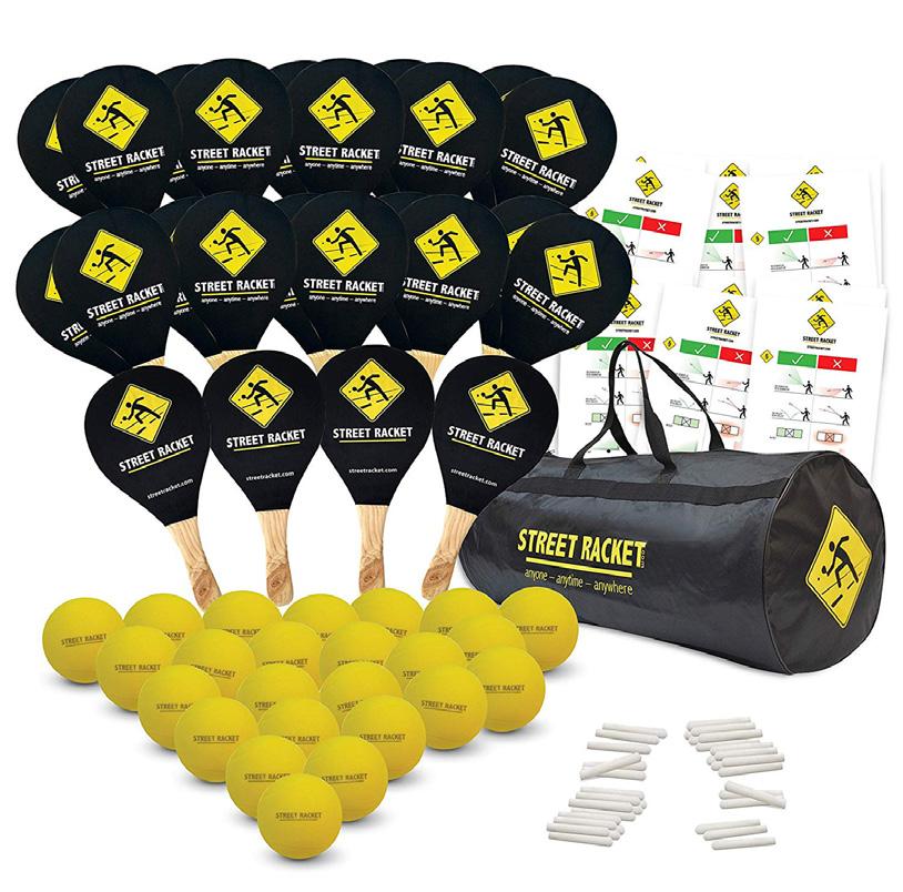 Street Racket er et engasjerende og actionfylt spill som passer for alle typer underlag, både innendørs og utendørs, og som krever minimalt med utstyr. Det er et ideelt valg for aktiviteter i kroppsøvingstimen eller i friminuttet på skoleplassen. 24 racketer, 24 baller, kritt, aktivitetskort og oppbevaringsbag.