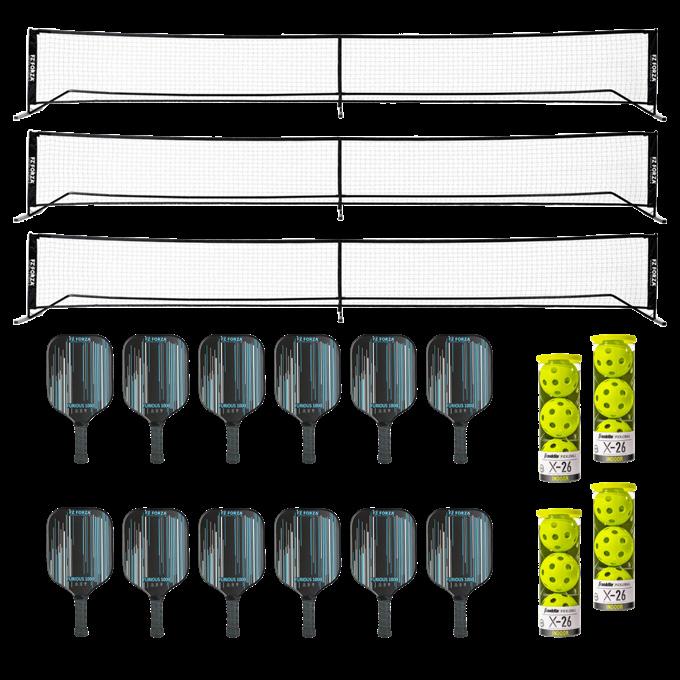Settet består av 12 FZ Forza racketer, 12 innendørsballer og 3 nett.