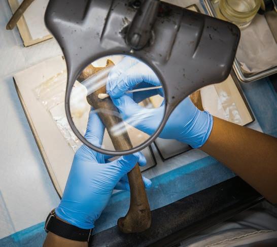 Research and Collections produced 73 publications during Fiscal Year 2025, with articles re ecting the incredible diversity of NHM’s research, ranging from new species of crocodile relatives and raccoons from the ancient past to environmental remediation using mineral science and a rst-of-its-kind atlas of how bird species got their names. Discoveries made national and local headlines, including a J. R. R. Tolkien—inspired goblin prince of a lizard, and appeared in high-pro le publications like Popular Science; the clearest picture yet of bird brain evolution lit up NPR’s airways.