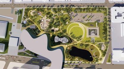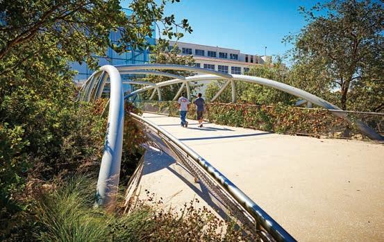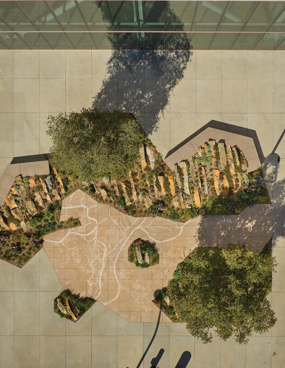 What once was an asphalt sea of parking lots and hardscape has been transformed into living habitats, extending the Museum’s footprint to include nature space and an outdoor living laboratory. The 3 1⁄2 acres are a “performative” landscape on all levels, with plants carefully selected and planted to enhance and foster biodiversity and sub-areas, which are interconnected. The gardens are also an interactive play area for kids, with a water feature, a pond, and the Get Dirty Zone where children learn about composting, as well as a Bird Viewing Platform just o the main path. We also created a Community Garden outside of NHM Commons, working with Indigenous artist, Lazaro Arvizu, on site-speci c mortar and pestles, as well as developed new didactics using reclaimed wood.