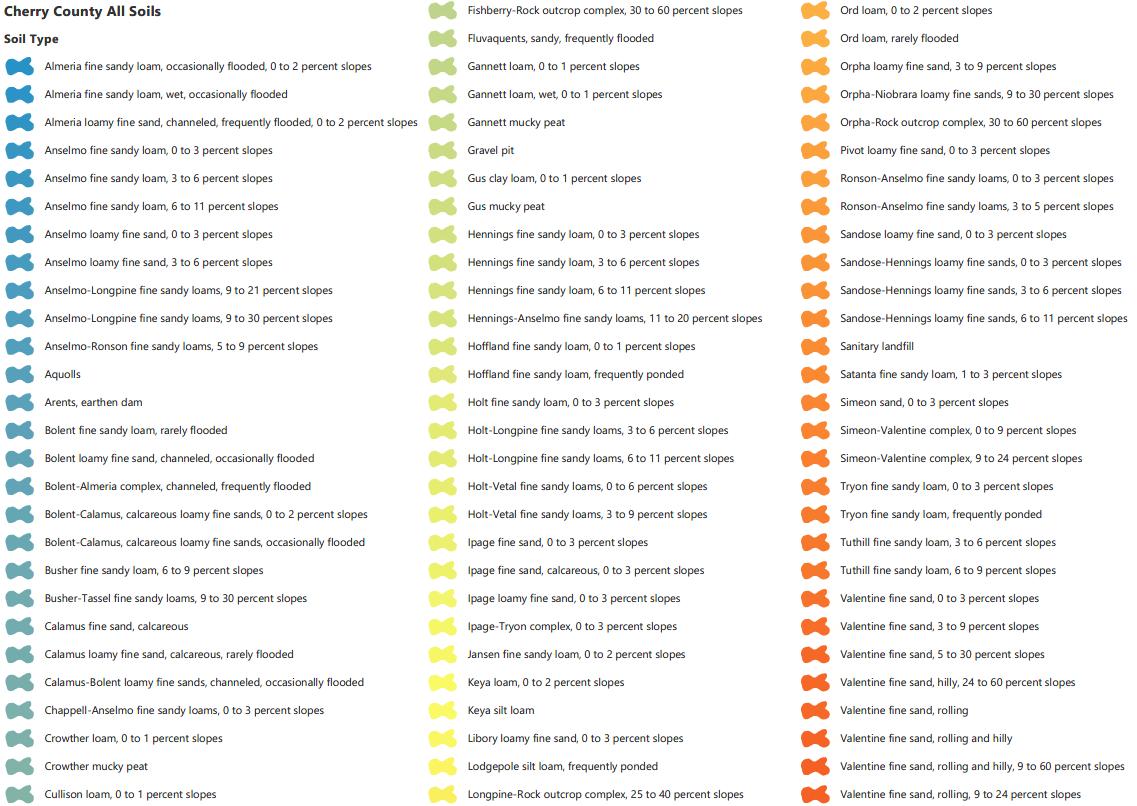 A map in these Appendices shows the soil suitability conditions for placement of small commercial businesses in Cherry County. Table A.1 provides the suitability by soil types and the specific conditions impacting the soil.