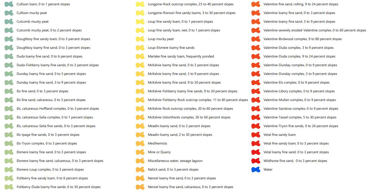 The characteristics of soils play a major role in determining the potential compatibility of certain uses on the land. The ability to absorb certain liquids such as water and wastewater are different for certain types of soils. In addition, how sensitive an area is to erosion or how shallow the soils are in an area can have a major impact on the ability to develop a specific area of Cherry County. These conditions and how they factor into a soils ability to support certain types of uses is referred to limitations.