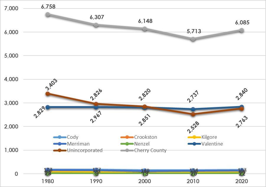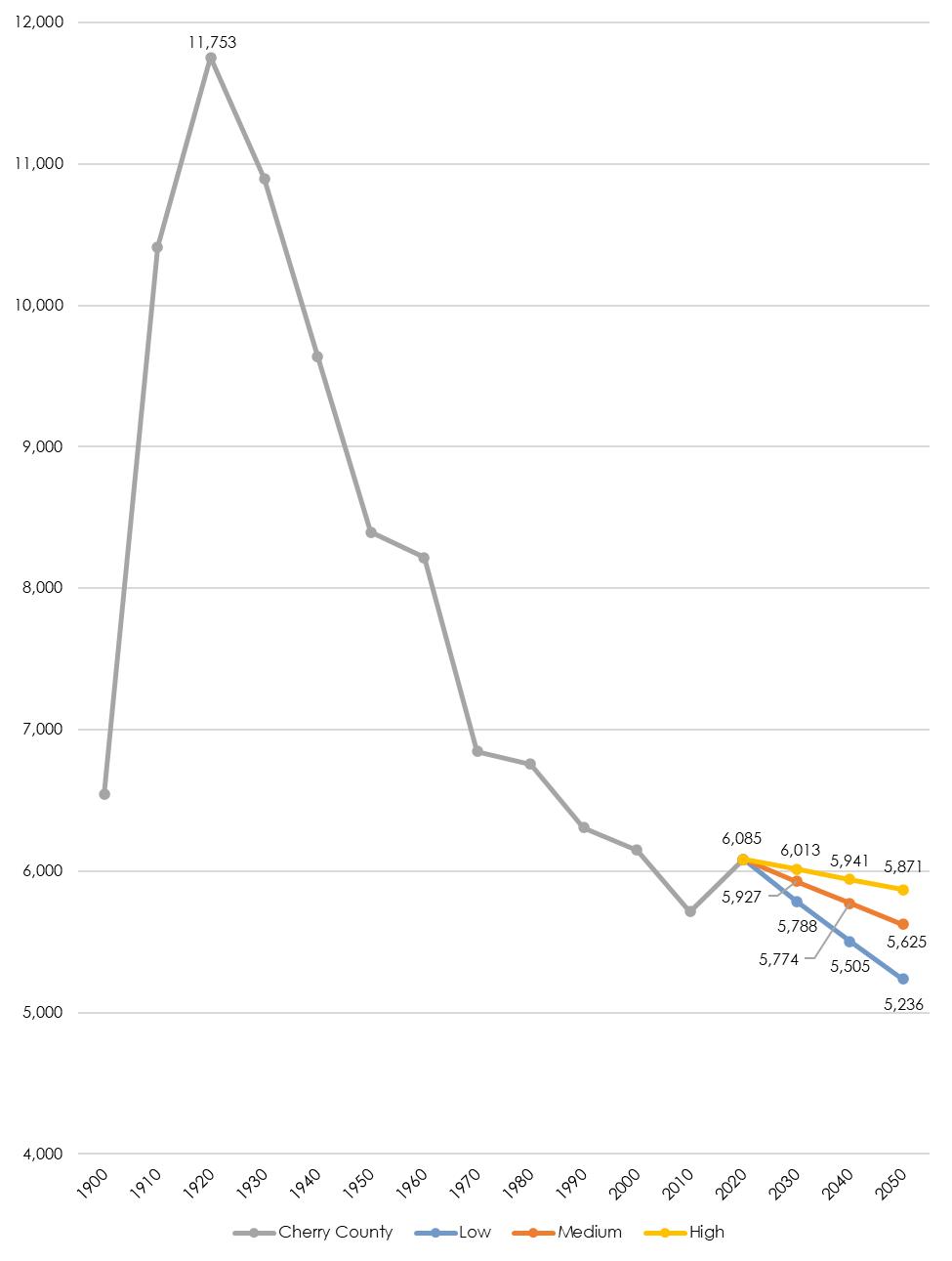 Population is the major catalyst driving everythingin a municipality or a county including housing, local employment, economies and fiscal stability. It is critical to understand how past population trends, when applied to the future, impacts the overall area. Cherry County needs to understand where the County has been, where it is currently, and where it appears tobe going.